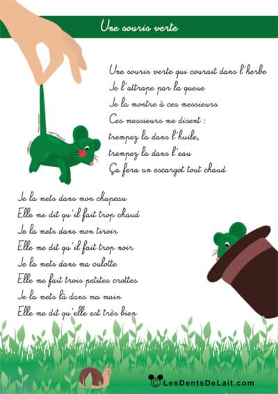 Génération après génération, en France et dans de nombreux pays francophones, chacun connaît cette chansonnette dont le déroulement, au fond, ne semble pas très cohérent… Vous conviendrez qu’une souris qui se transforme en escargot, ce n’est tout de même pas banal ! Et, à moins de la rencontrer après un plongeon dans un pot de peinture, personne ne s’est jamais vanté d’avoir croisé une souris verte… Et pourtant, mon histoire invraisemblable est bien plus ancrée dans la réalité qu’elle n’en a l’air.