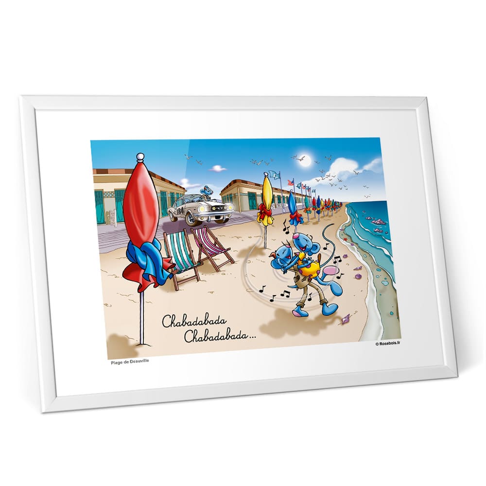 Cette affiche déco reprend une illustration extraite de l’album jeunesse La Petite Souris en Normandie. C’est un clin d’œil à la scène mythique du film de Claude Lelouch « un homme et une femme » quand les deux héros se retrouvent sur la plage de Deauville. On peut également apercevoir la fameuse Ford Mustang n°184 qui fait des appels de phare.
