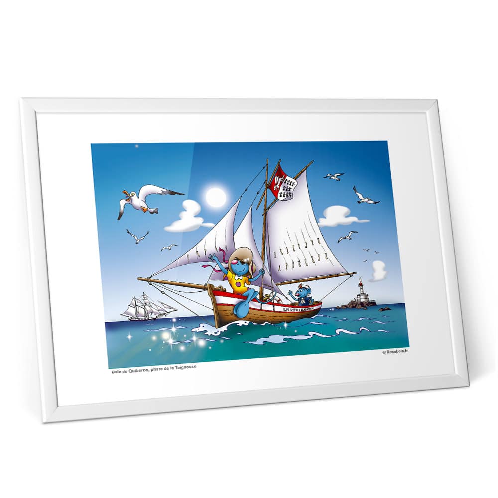 Cette affiche de bateau reprend une illustration extraite de l’album jeunesse La Petite Souris en Bretagne, une histoire qui se déroule dans le Morbihan. La Petite Souris et son compagnon naviguent sur un voilier en bois par un temps splendide (ceux qui ont lu ce livre pour enfants savent que cela ne va pas durer…). Ils sont partis du port de Quiberon et dépassent le phare de la Teignouse qui est situé entre la presqu’île de Quiberon et l’île de Houat.