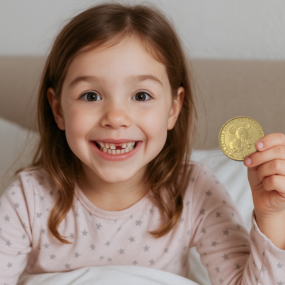 De très belles pièces aux reflets d’or à l’effigie de la Petite Souris pour remplacer avantageusement les pièces de monnaie qu’elle vient glisser sous l’oreiller des enfants qui ont perdu une dent de lait. Elles font le bonheur et l’émerveillement des bambins qui les découvrent en se réveillant.